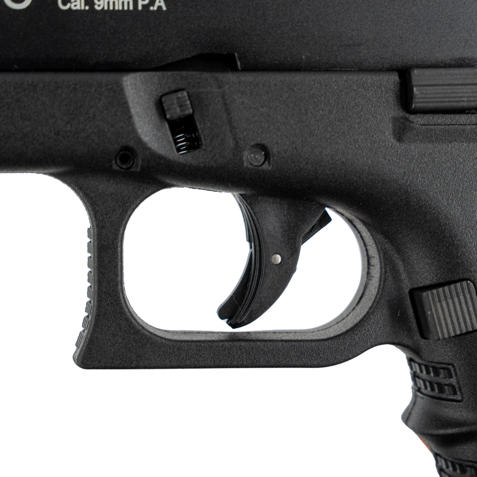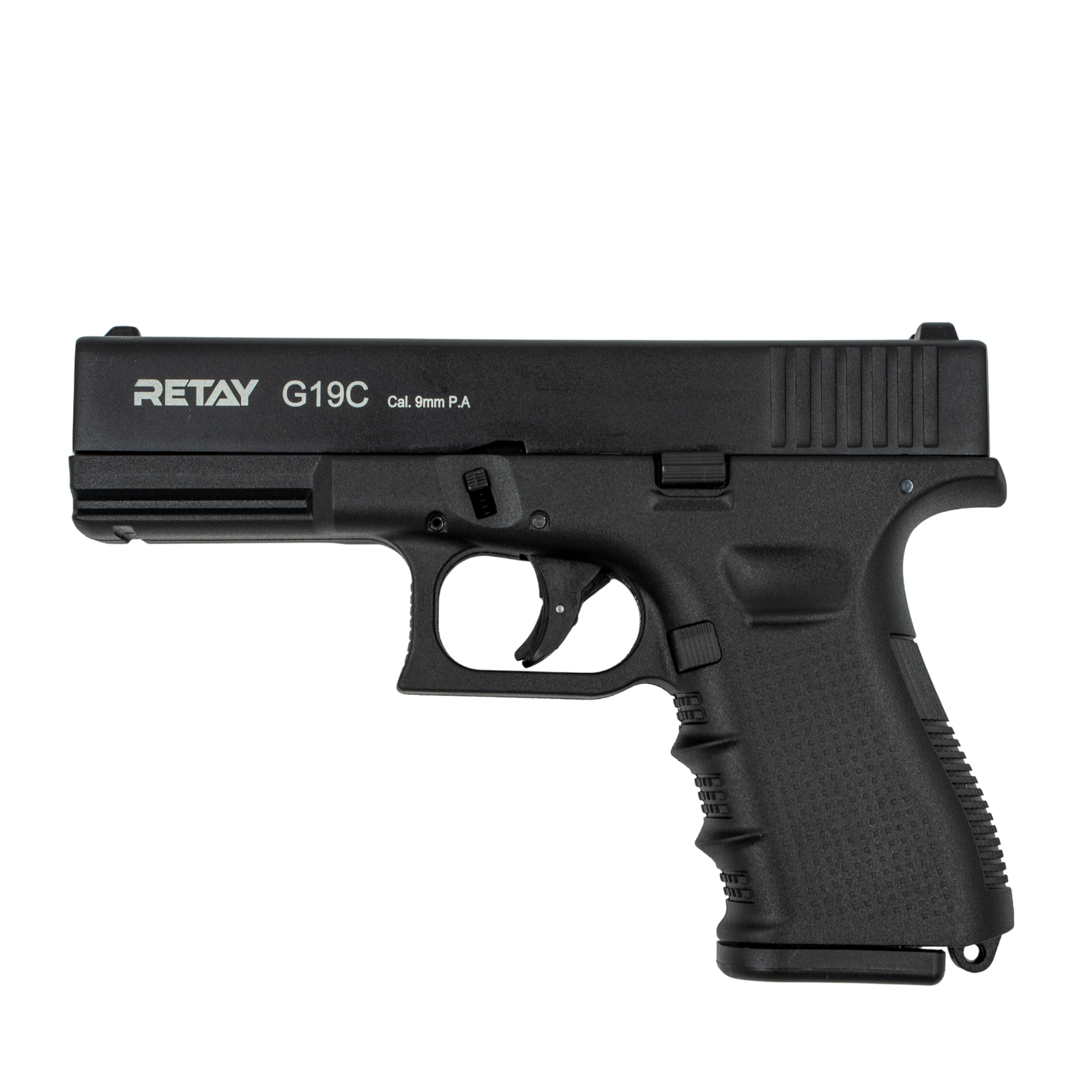 La RETAY G19C es una pistola traumática semiautomática de formato compacto, inspirada en el diseño de la Glock 19. Con sistema blowback realista y calibre 9mm P.A.K., ofrece una experiencia de disparo auténtica sin ser letal, siendo ideal para defensa personal legal, entrenamientos tácticos o porte discreto.