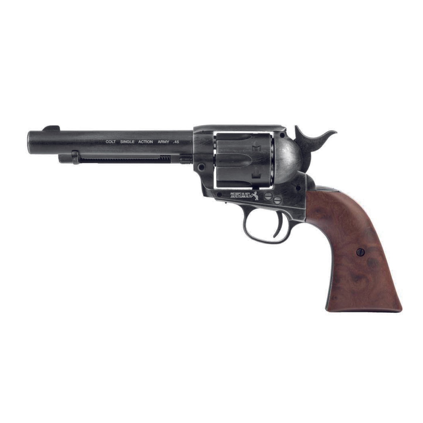Esta réplica del clásico "Peacemaker" captura la estética del Viejo Oeste con su atractivo acabado Antique Finish. Funciona con CO2, ideal para tiro al blanco y plinking. Dispara balines de calibre .45 a una velocidad de hasta 130 m/s. Su tambor de 6 rondas y su seguro manual garantizan una experiencia segura y divertida. Fabricado en metal y ABS, con empuñadura de madera sintética para un mejor agarre. Rememora la época de los vaqueros con este revólver Umarex.